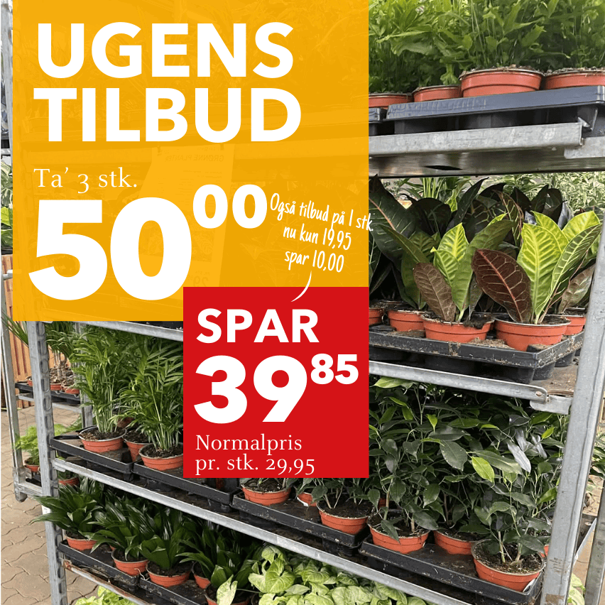 Frisk fra leverandør. F.eks. Bjergpalme, Kroton, Sigøjnerblad, Bånd dracaena, Gummifigen, Stue asparges m.fl. Frit valg 3 stk. 50,- eller 1 stk. 19,95