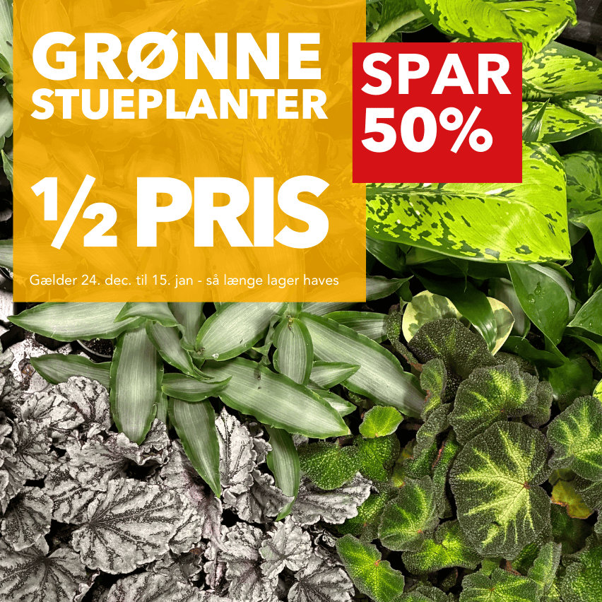 Halv pris på alle grønne stueplanter. Shop amok i store og små varianter. Undtagen miniplanter, hvor prisen i forvejen er minimal.