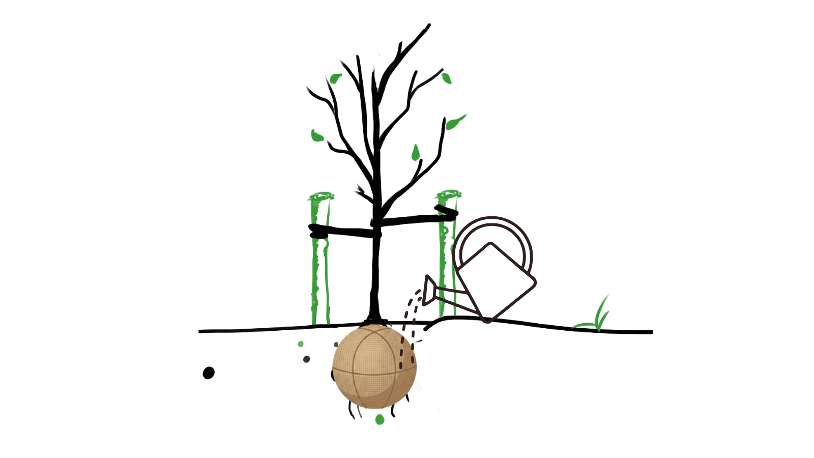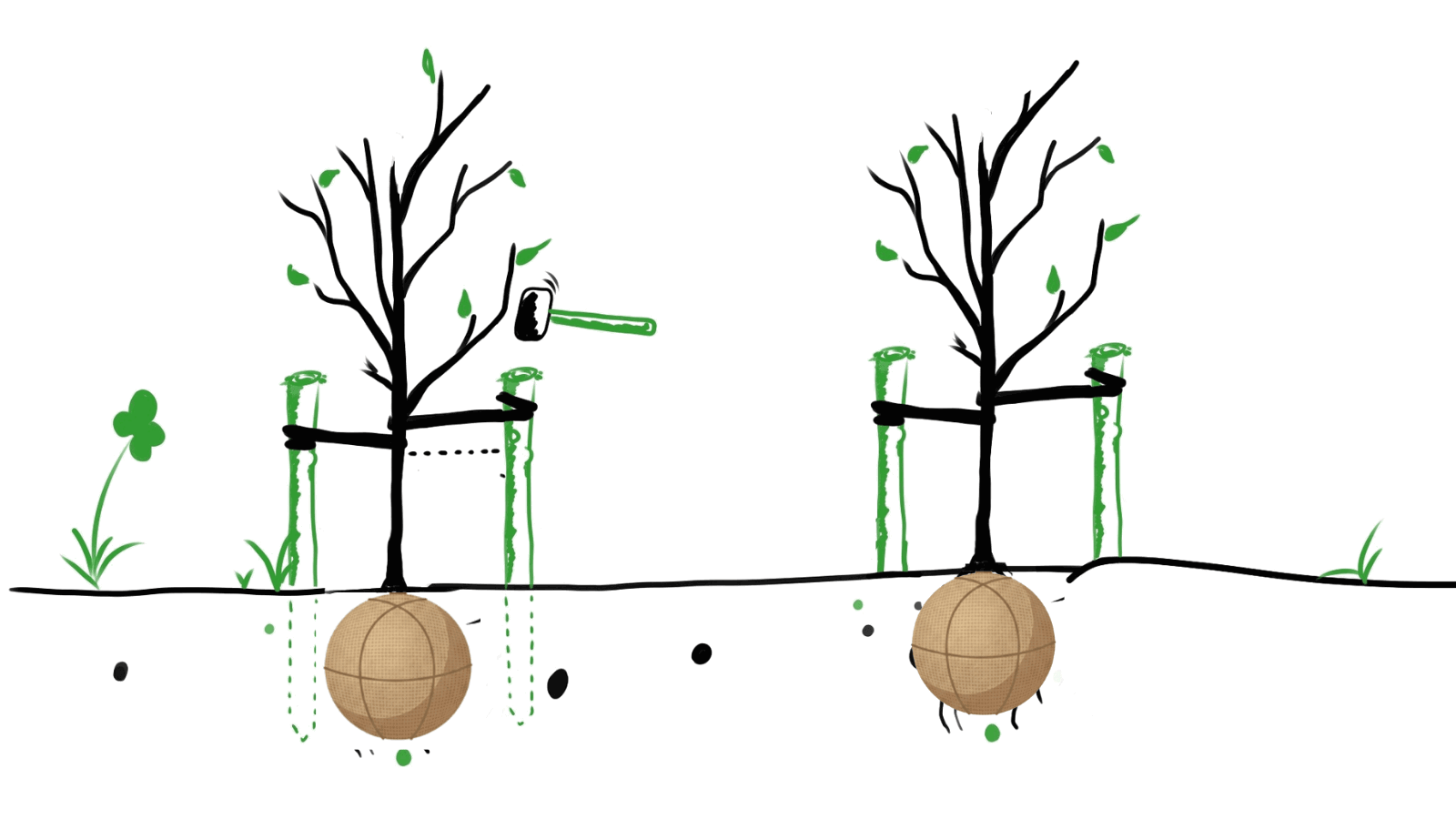 For at sikre stabilitet og sund vækst skal træer med klump støttes med pæle.