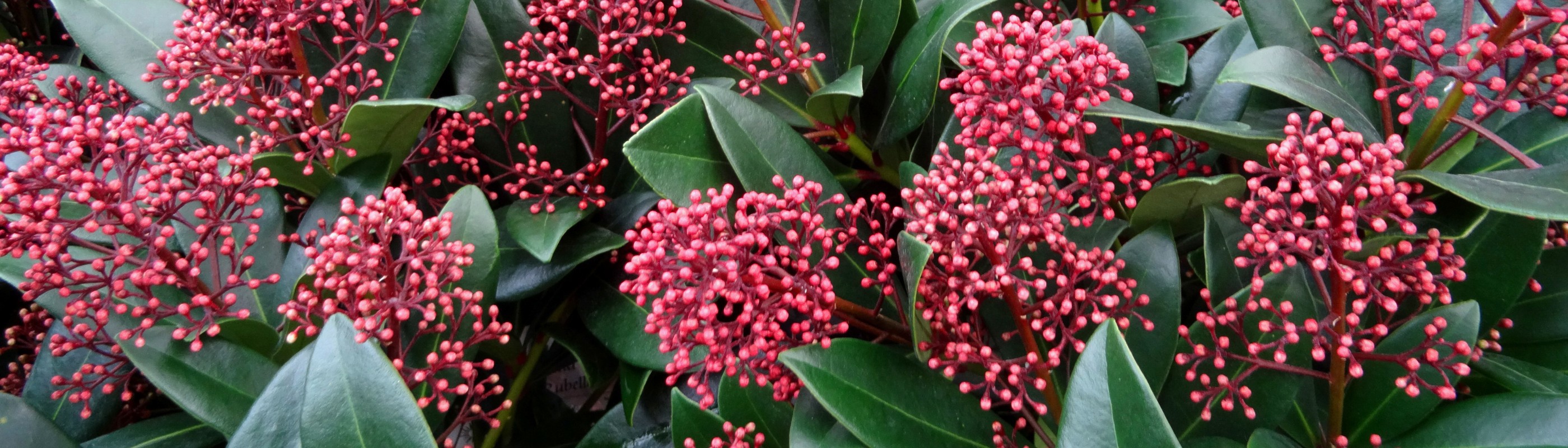 Skimmia er en stedsegrøn surbundsplante, der trives i skygge til halvskygge. Nogle sorter har dekorative røde bær, mens andre har flotte blomsterknopper, der åbner sig om foråret. Planten pynter både i haven og i krukker og er nem at passe. Med sin kompakte vækst og vintergrønne blade tilføjer Skimmia farve og liv året rundt.
